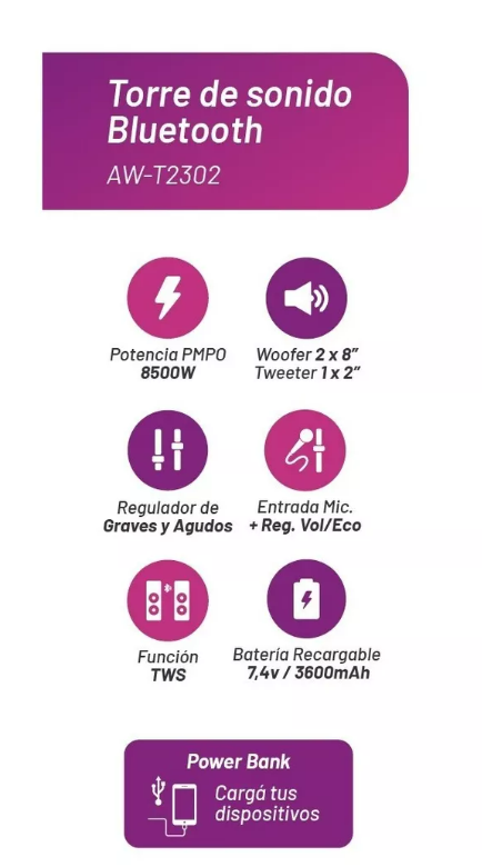 Bafle Aiwa Aw-T2302 8" X2 Twiter 1X2" 8500W Pmpo Bluetooth/Bat/Tws