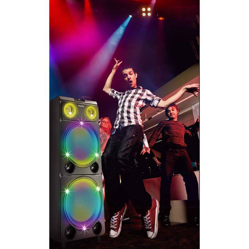 PARLANTE TAX5509/77 PHILIPS - Party Speaker Bluetooth - Potencia 260W RMS - 2x Woofer 12" - Consola superior para regular volumen,ecualizador y luces - Entrada para Micrófono y Guitarra - Función karaoke - Radio FM - Luces rítmicas - Alcance Bluetooth: 10 metros - Control remoto incluído - Garantía fabricante 12 meses - Origen China