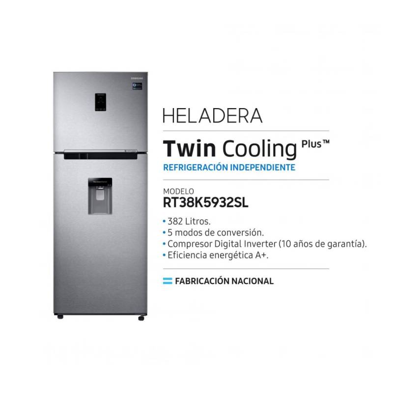 Comprá tu Heladera SAMSUNG RT38K5982SL/B3 No Frost, Freezer Superior con capacidad de 394 litros. Sistema Twin Cooling Plus para preservar los alimentos frescos en la nevera con un 70% de humedad, comparada con el 30% de un frigorífico convencional. De esta manera, mantiene los ingredientes frescos durante más tiempo sin secarlos. Enfria los alimentos de manera separada para evitar olores indeseados que pasan de la nevera al congelador. Con fábrica de hielo automatica y enfriador rapido de bebidas y alimentos con solo tocar un boton.