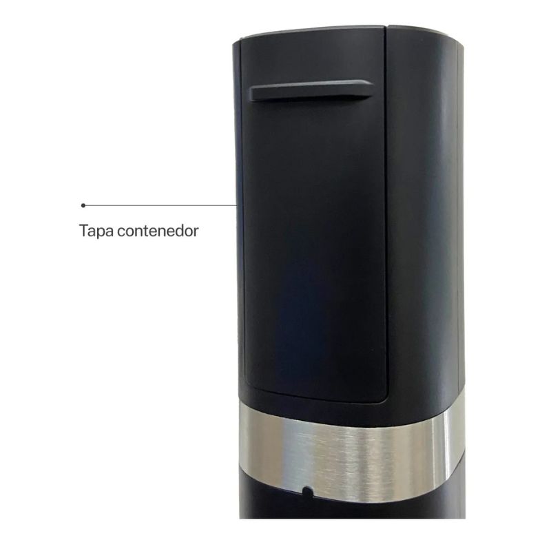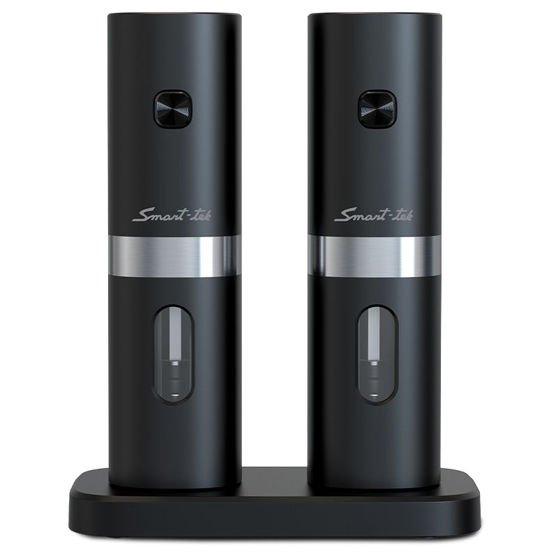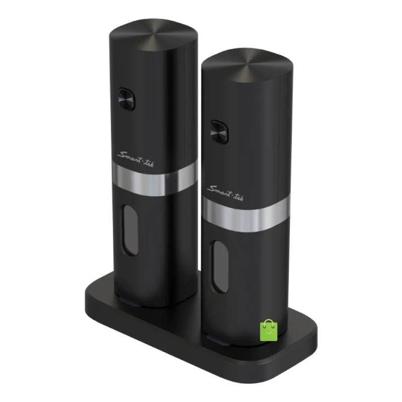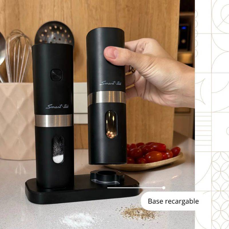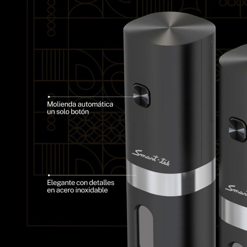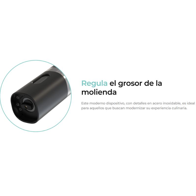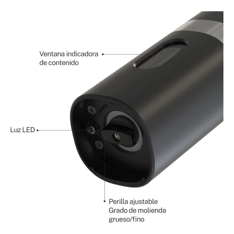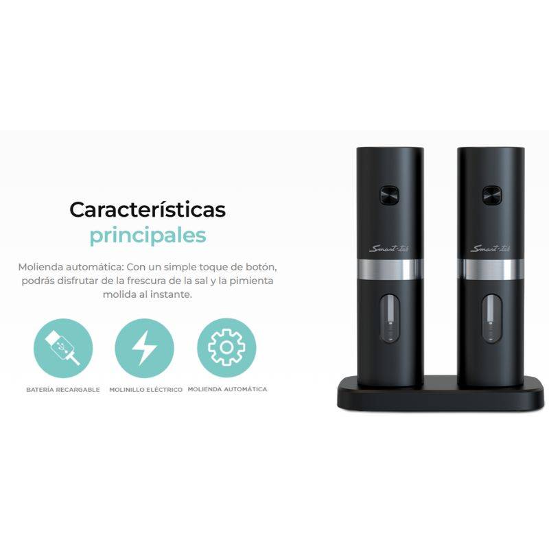 • Elegante con detalles en acero inoxidable. • Molienda automática con un solo botón. • Recipiente recargable en la parte posterior. • Base de carga recargable. • Ventana indicadora del contenido restante. • Luz LED de encendido automático. • Molinillo ajustable. • Muele fácilmente pimienta y sal de gruesa