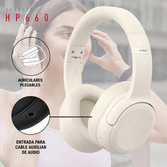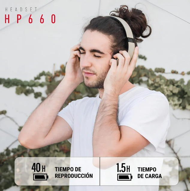 HP 660 HEADSET BLUETOOTHCARACTERÍSTICAS: • Bluetooth V5.3 • Diseño ergonómico y confortable • Función manos libres • Liviano, Plegable y Portátil • Parlantes Ø40 mm • Frecuencia 20 Hz-20 kHz • Entrada AUX-in 3.5mm • Indicador LED de funcionalidad • Batería de los auriculares: 300 mAh • Tiempo de carga 1,5 horas • Tiempo de conversación: 35 horas • Tiempo de reproducción: 40 horas (VOL 70%)