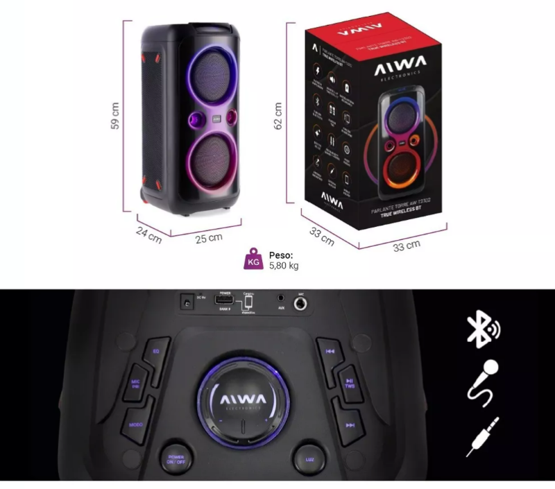 Bafle Aiwa Aw-T806F-Pb 6.5" X2 Twiter 1X1" 8000W Pmpo Bluetooth/Bat 3600 Mah/Tws