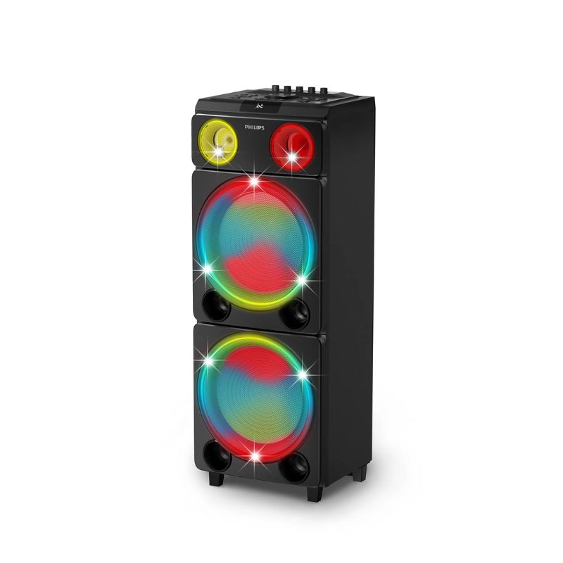 PARLANTE TAX5509/77 PHILIPS - Party Speaker Bluetooth - Potencia 260W RMS - 2x Woofer 12" - Consola superior para regular volumen,ecualizador y luces - Entrada para Micrófono y Guitarra - Función karaoke - Radio FM - Luces rítmicas - Alcance Bluetooth: 10 metros - Control remoto incluído - Garantía fabricante 12 meses - Origen China